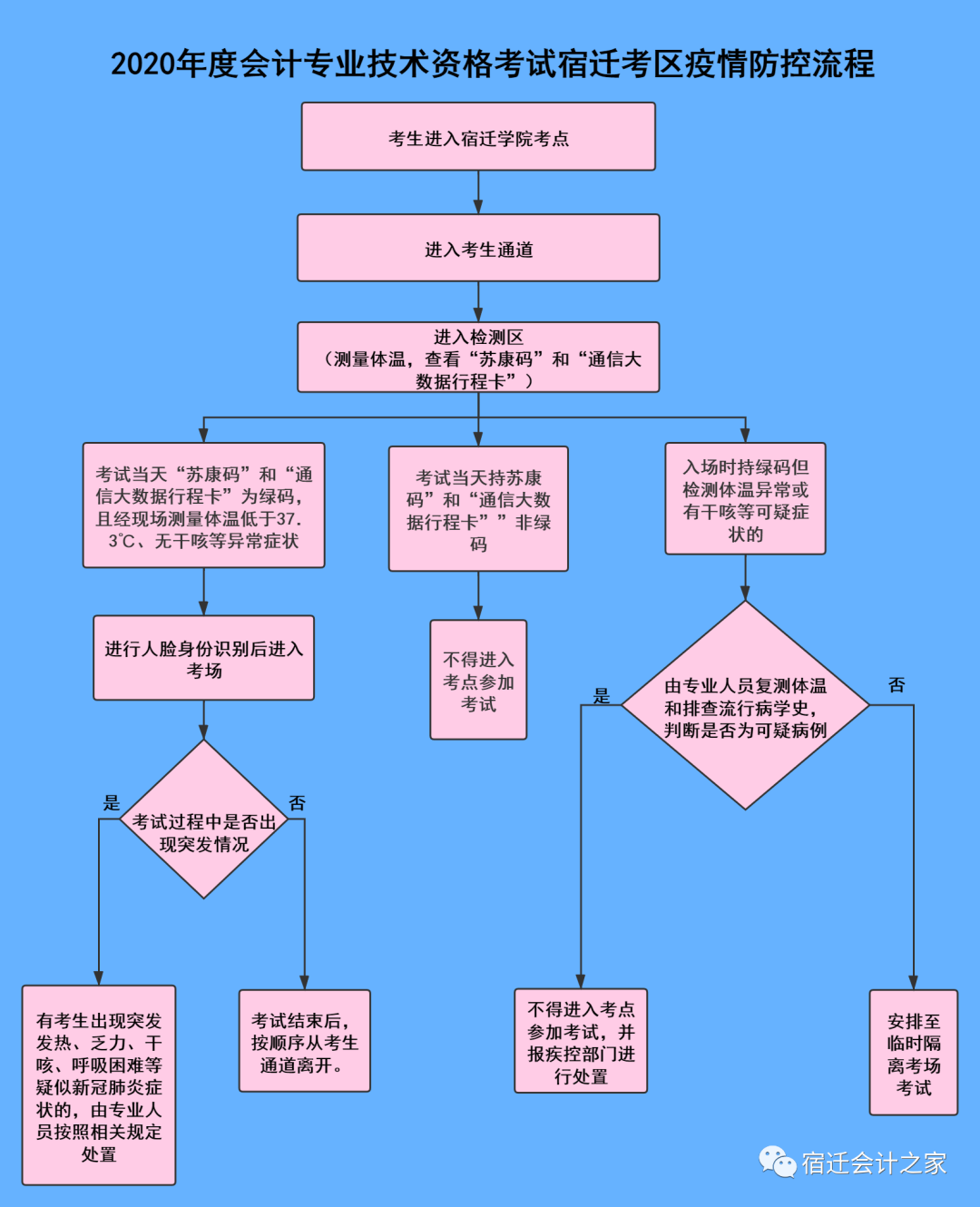 根据江苏省财政厅《关于调整2020年度全国会计专业术资格考试(江苏考区)考务日程安排及有关事项的通知》(苏财会〔2020〕17号)精神,宿迁考区会计资格考试定于8月29日至9月7日期间进行。为平稳有序做好宿迁考区疫情防控及考试组织工作,守住不发生区域性聚集性疫情传播风险底线,确保广大考生及考务人员身体健康和生命安全,根据省财政厅、人社厅、卫健委《关于印发2020年全国会计专业技术资格考试江苏考区新冠肺炎疫情防控工作方案的通知》(苏财会〔2020〕21号)精神和我市常态化疫情防控工作需要,现就宿迁考区考生相关防疫要求公告如下: